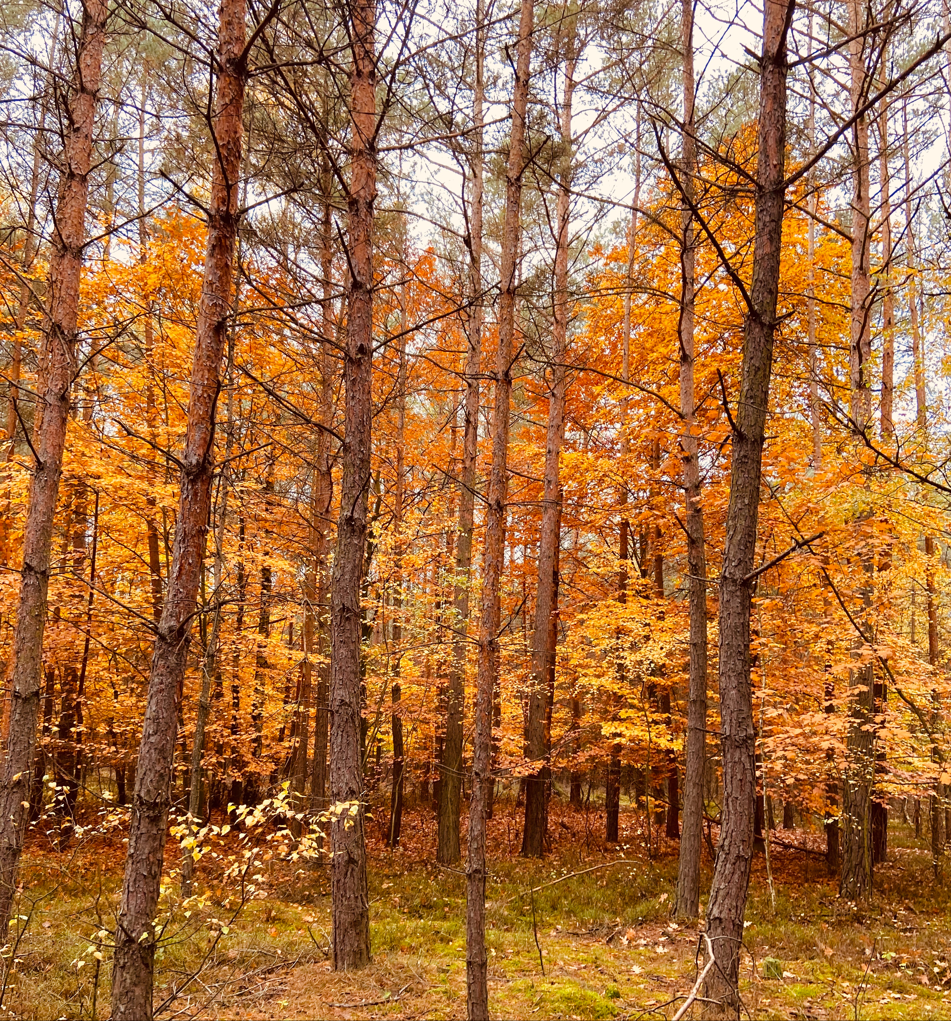 A carpet of brown on the forest floor.