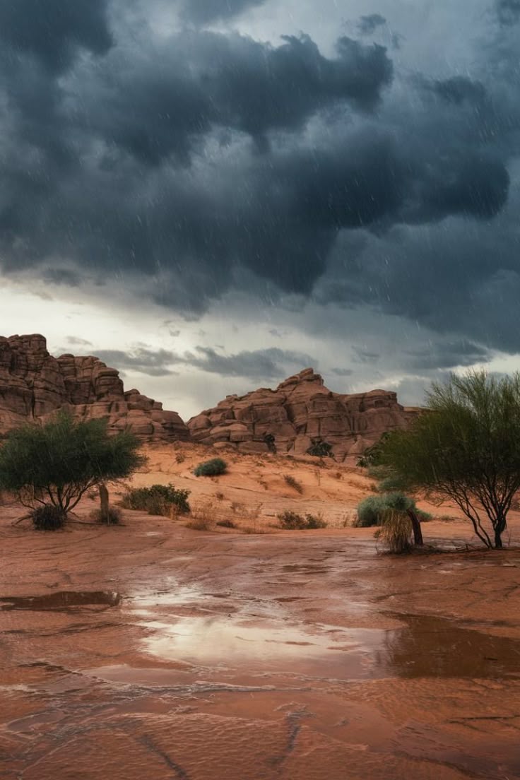 The first time I encountered the desert rain, something in me shifted. I resisted the loosening of the soil, the sudden drop in temperature, and the disappearance of fissures that gave me character. The thunder’s roar and the torrential rain, so unlike the parched and gusting winds preceding it, created a momentary lull — followed by a sudden chaos that changed everything beyond recognition. The exposure of the weakened parts of the rough terrain is a terrifying thought. What stayed buried underneath becomes visible. The darker, less ostentatious, and broken insides of the desertscape can no longer be stored away as an embarrassing secret. The desert rain is like a forced confession; a cataclysmic event that soothes and softens me. The cragged, rocky grounds are touched by something that feels gentler and calmer than the merciless rays of the looming sun.