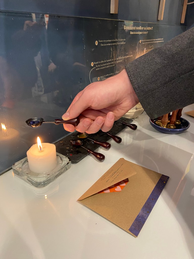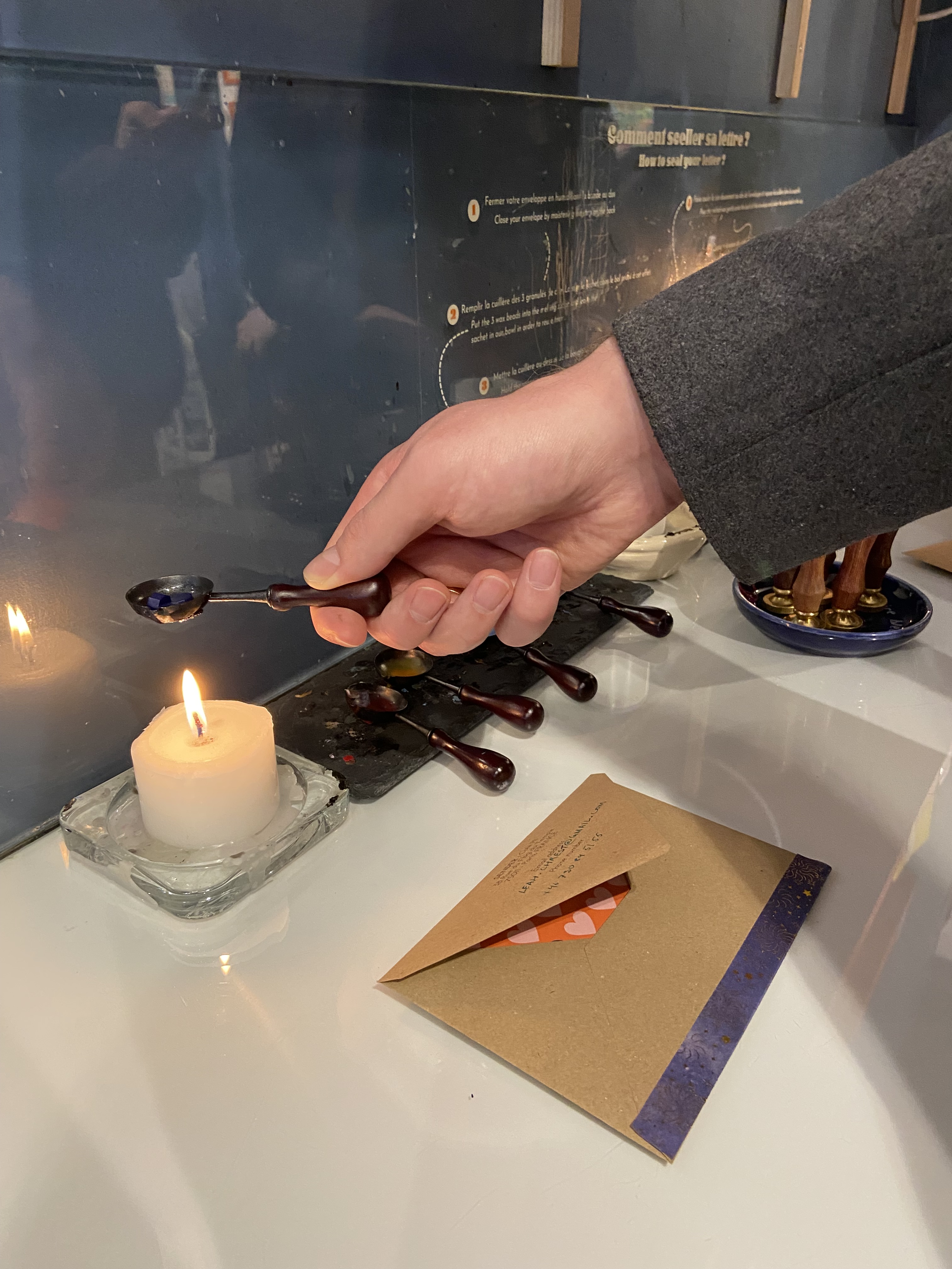 I had to reserve two spots at least two months in advance. The concept of the cafe is quite simple: you choose a time period – months, 5, or 20 years. The amount you pay at the end is priced depending on when you want your letter to arrive. The longer the wait, the more you pay. You can choose the type of paper, the decorations, the stickers, and a theme card for your letter. In total, the weight of the letter cannot exceed 20 grams. Once your letter has been composed, you choose the type of seal wax and place it in the respective month-year slot. You pay 25 euros for the whole ordeal, and it includes a free drink!